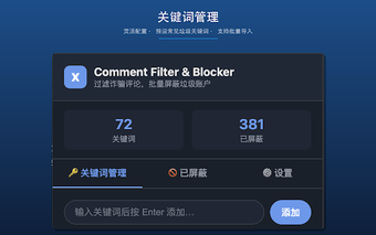X Comment Filter & Blocker adalah ekstensi untuk Chrome yang dirancang untuk membantu pengguna mengelola komentar yang tidak diinginkan di platform X (Twitter). Dengan fitur pemindaian cerdas, ekstensi ini secara otomatis mendeteksi komentar yang mengandung kata kunci tertentu dan dapat memblokir akun yang memposting spam secara massal. Ekstensi ini juga mendukung pengelolaan kata kunci secara fleksibel, memungkinkan pengguna untuk menambahkan dan menghapus kata kunci sesuai kebutuhan.